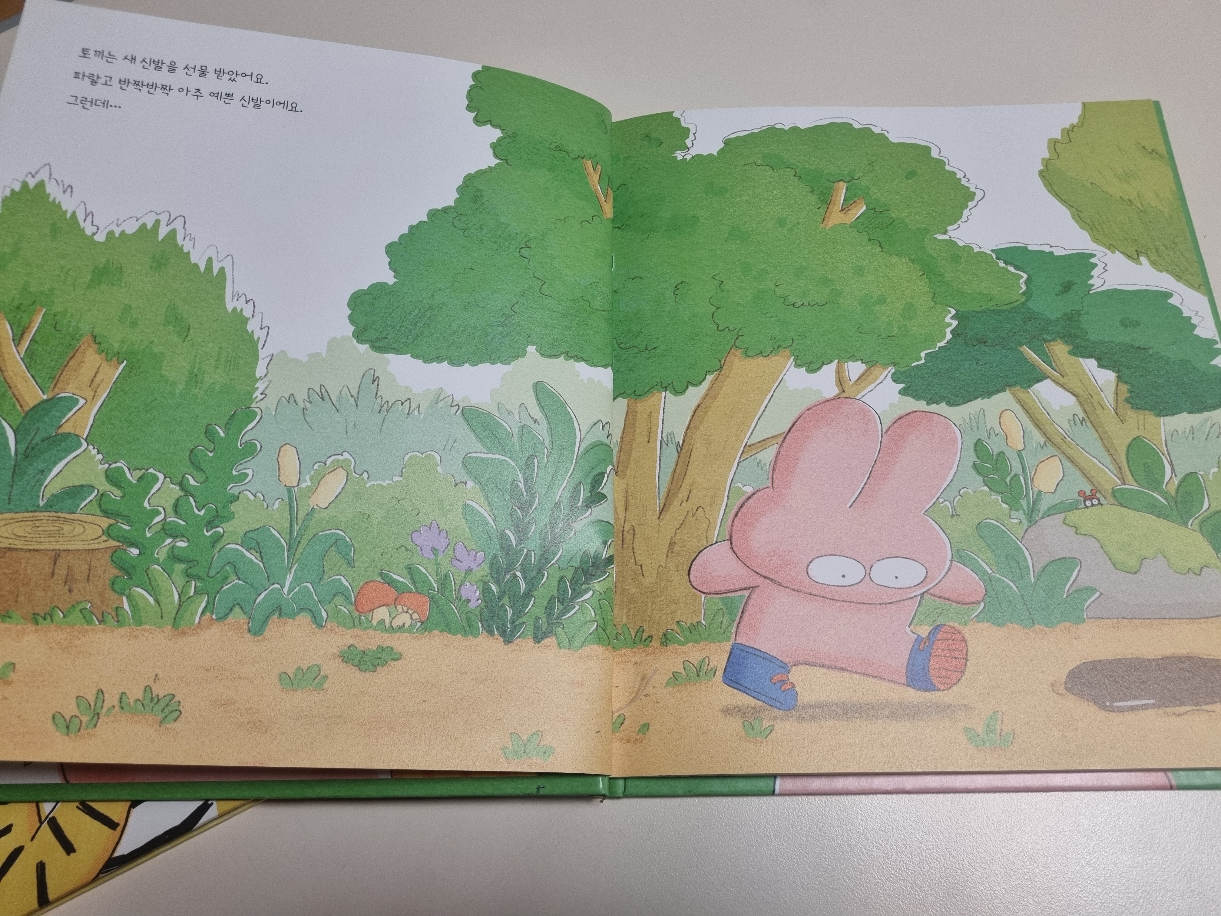 책의 스토리는 주인공 토끼가 선물 받은 새 신발을 신고 나가면서 시작됩니다.