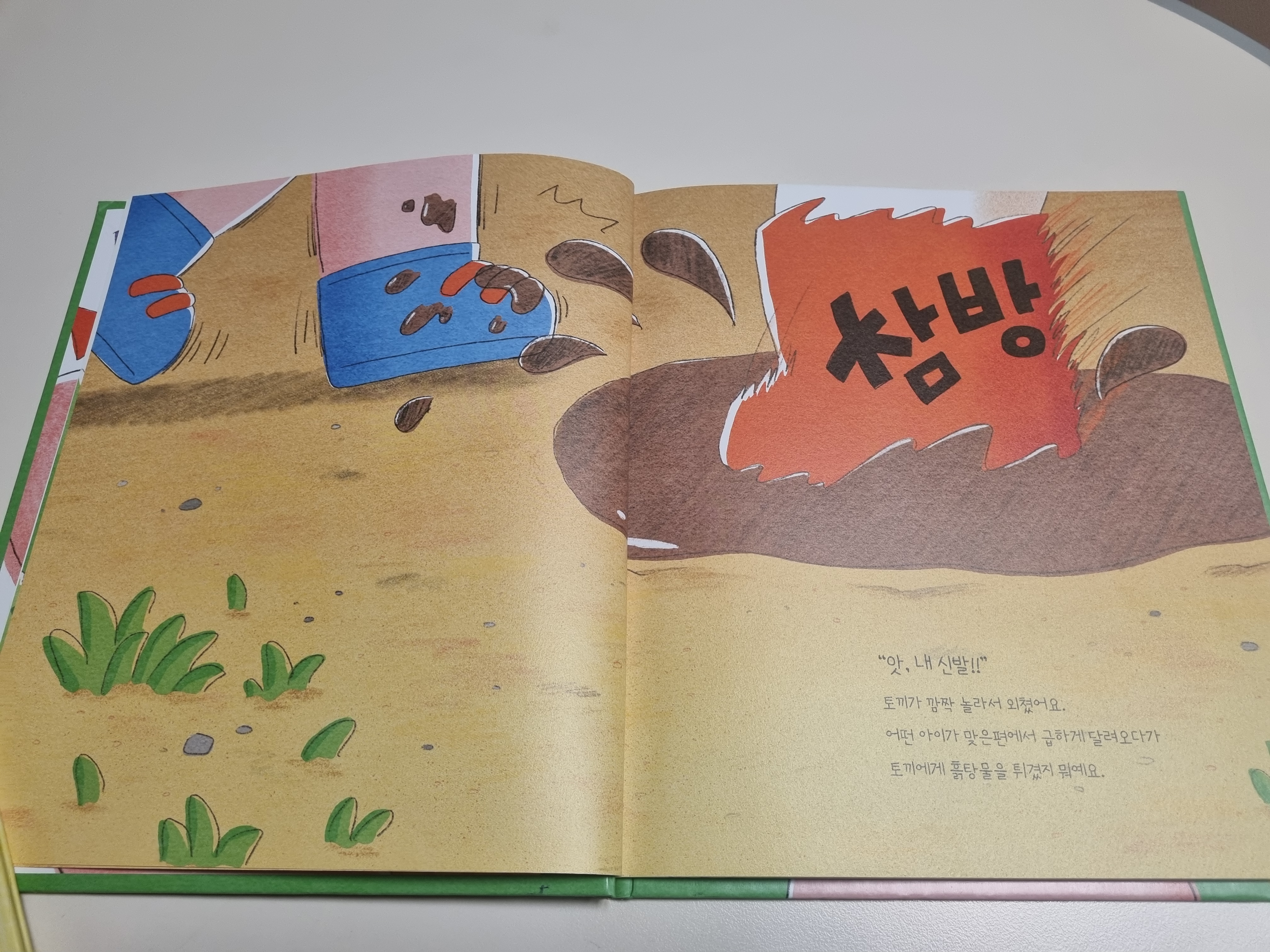 그러다가 누군가가 토끼의 새 신발에 흙탕물을 튀기게 되고, 신발이 확 더러워져 토끼가 슬퍼하게 됩니다.