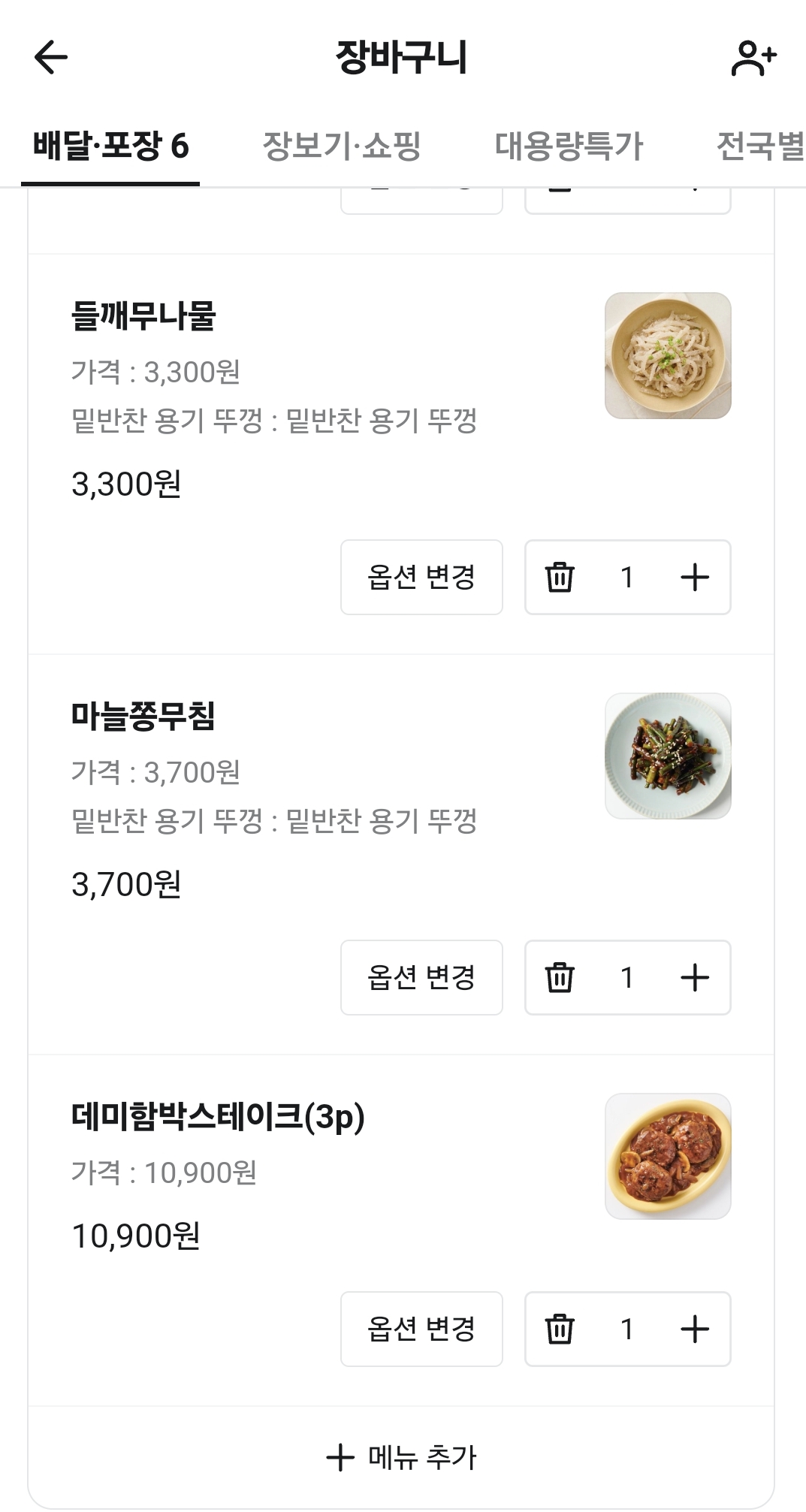 저는 배민으로 주문했고 매장 첫 주문 쿠폰을 받아서 3만 원 이상 구매 시 5천 원 할인 쿠폰을 사용할 수 있었습니다. 메인 반찬으로는 데미함박스테이크를 선택했고 밑반찬으로 들깨무나물, 연근조림, 미역줄기볶음, 멸치볶음, 마늘쫑무침을 구입했습니다.