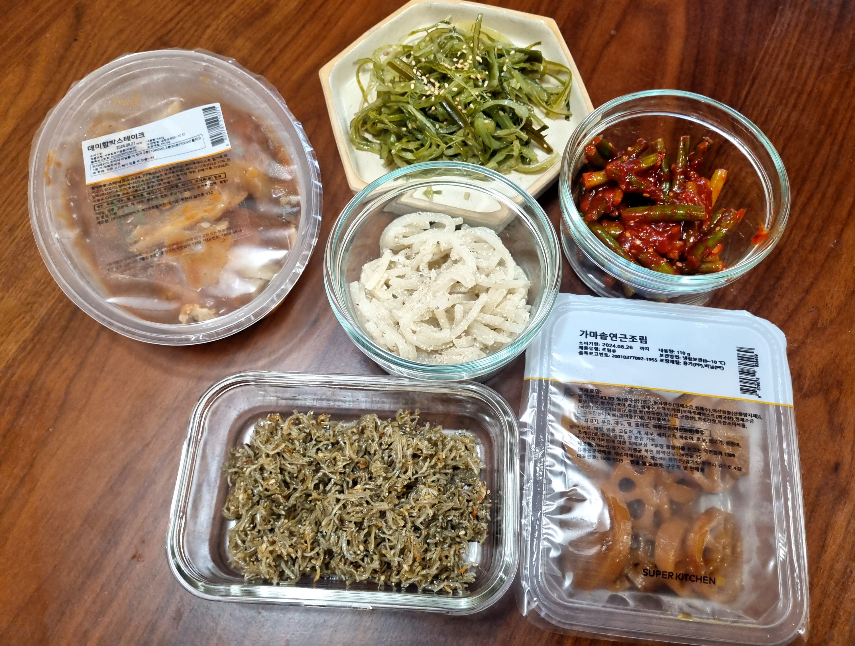 구입한 반찬은 총 6가지로 일부는 그릇에 옮겨 담아 놓았습니다. 각 반찬 양은 3인 가족이 한 끼 차려먹기에 적당한 양으로 많지도 적지도 않은 것 같습니다.