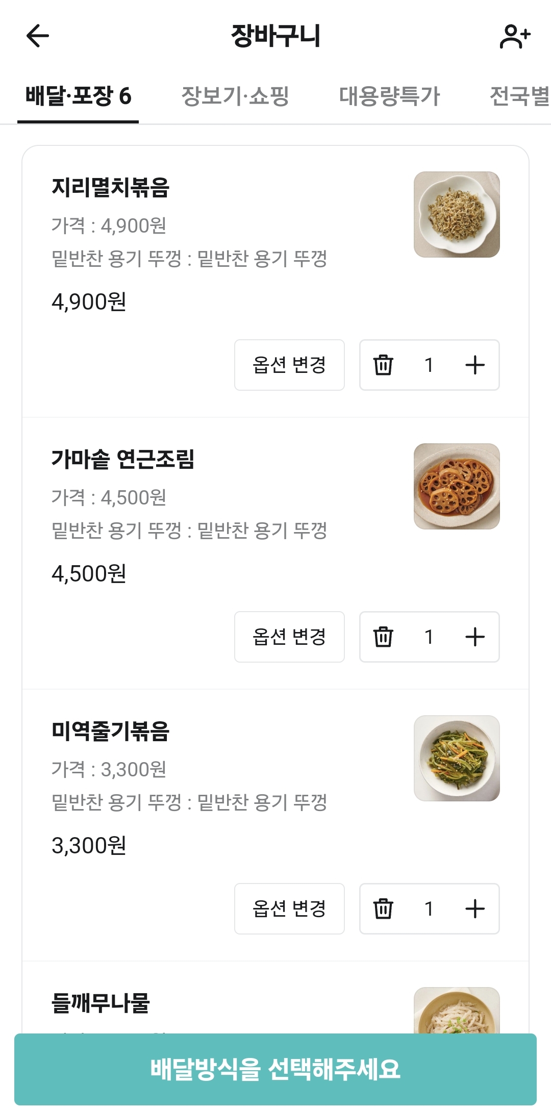 저는 배민으로 주문했고 매장 첫 주문 쿠폰을 받아서 3만 원 이상 구매 시 5천 원 할인 쿠폰을 사용할 수 있었습니다. 메인 반찬으로는 데미함박스테이크를 선택했고 밑반찬으로 들깨무나물, 연근조림, 미역줄기볶음, 멸치볶음, 마늘쫑무침을 구입했습니다.