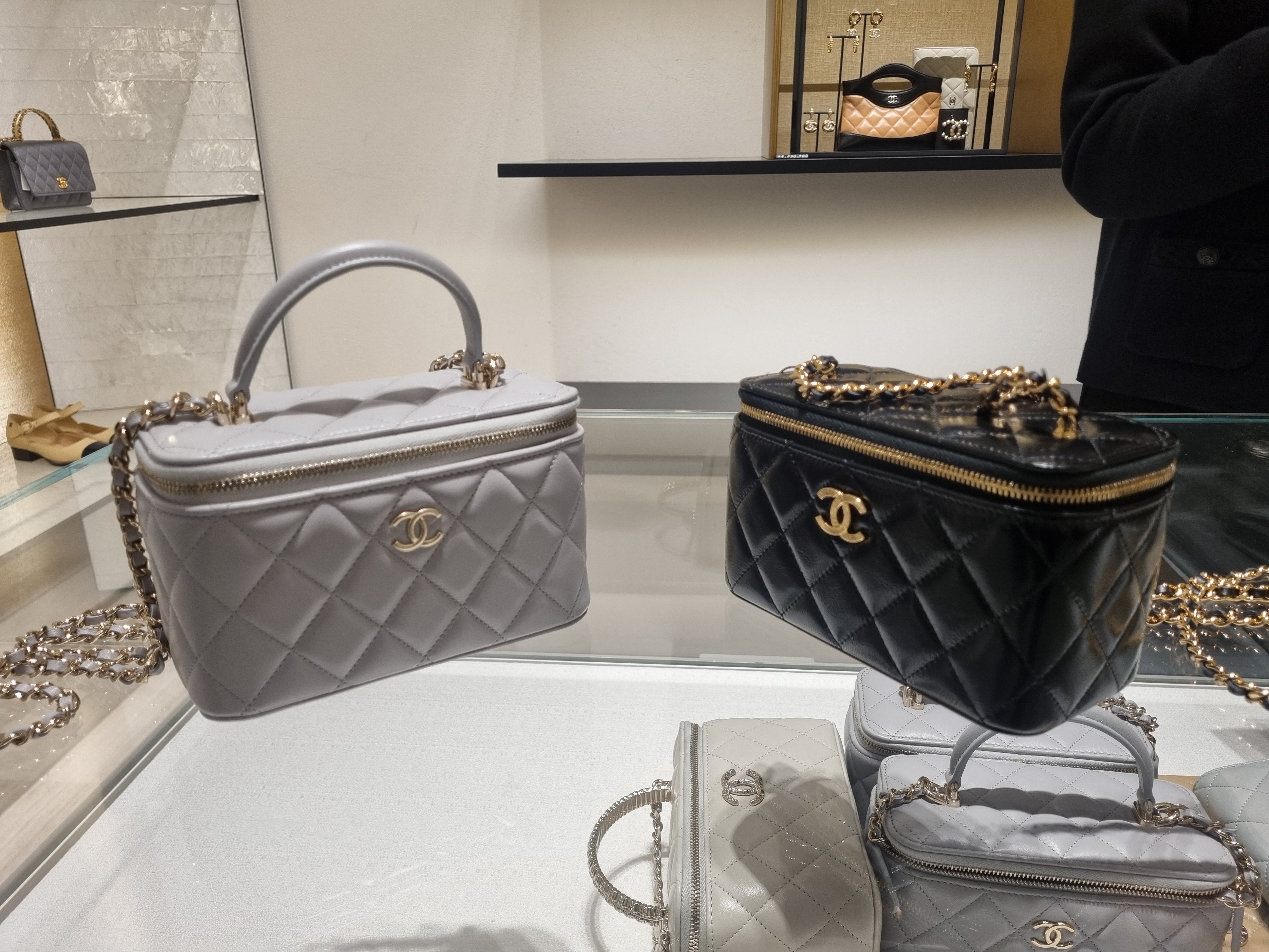 핸들 없는 블랙 기본 코스메택백은 450만 원, 핸들 있는 그레이 백은 480만 원 정도였다