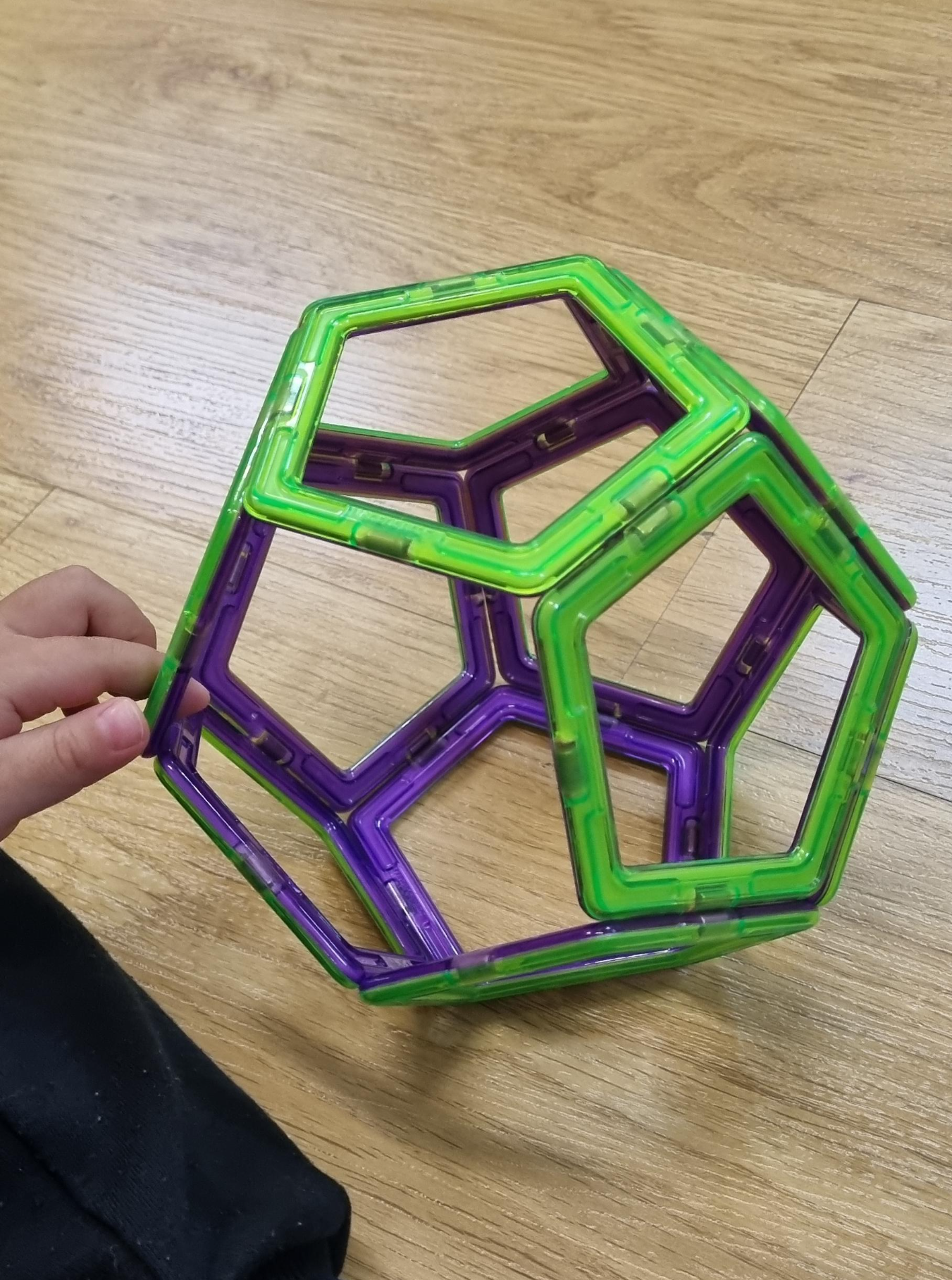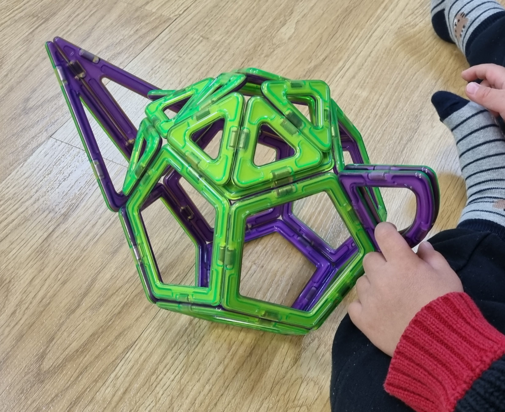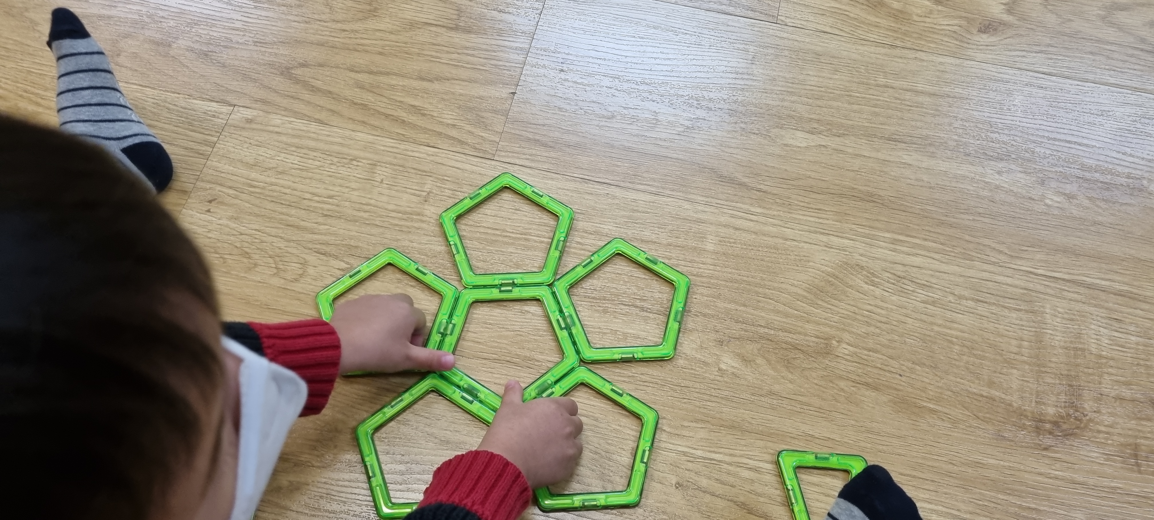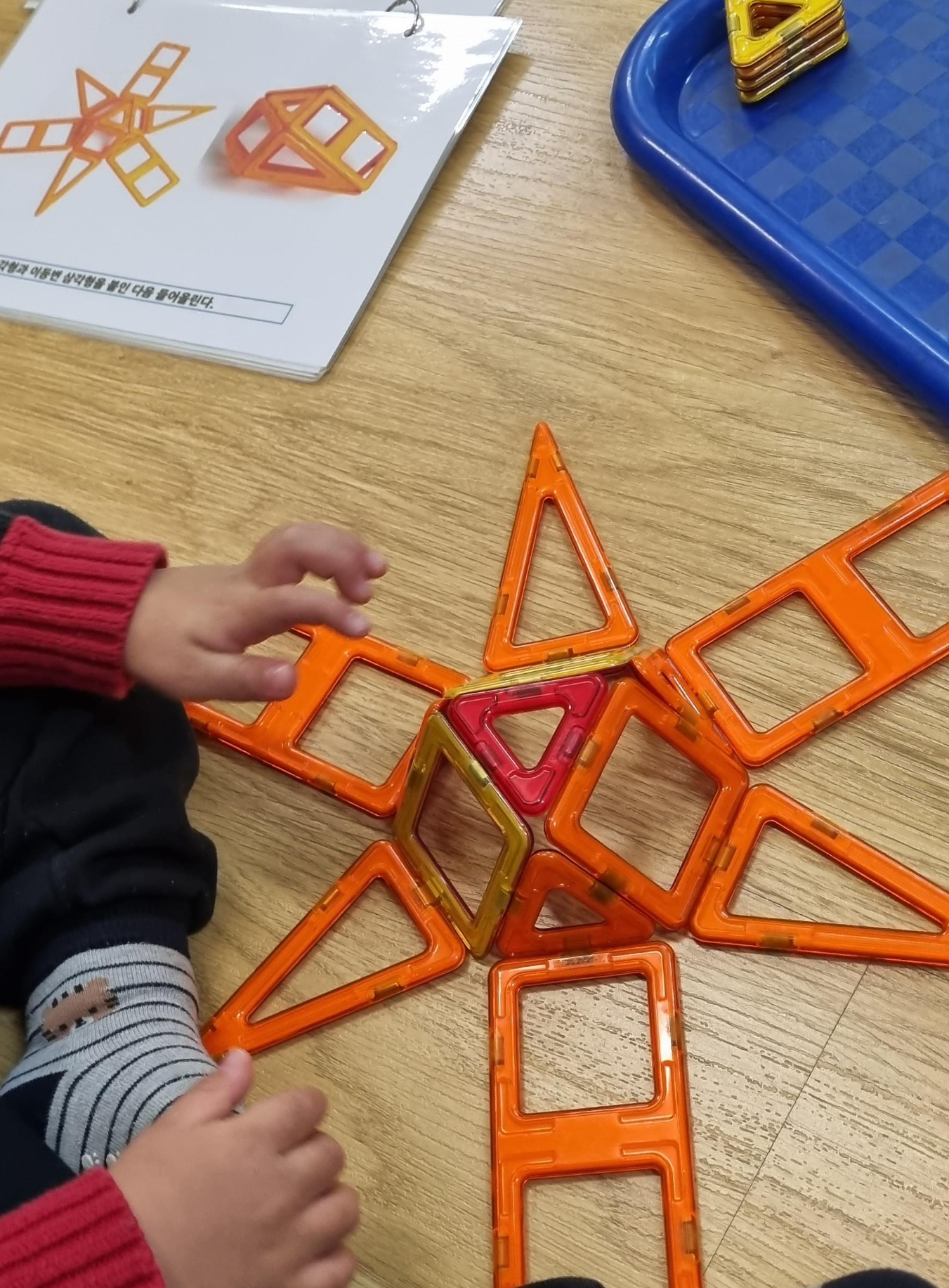 아래처럼 평면으로 도형의 전개도를 만든 후 집어서 들면 자석 블럭이기에 쉽게 입체 도형으로 만들어지게 됩니다. 이 과정을 통해 입체 도형이 어떤 면으로 구성되는지, 전개도는 어떤 형태인지 체득하게 됩니다.